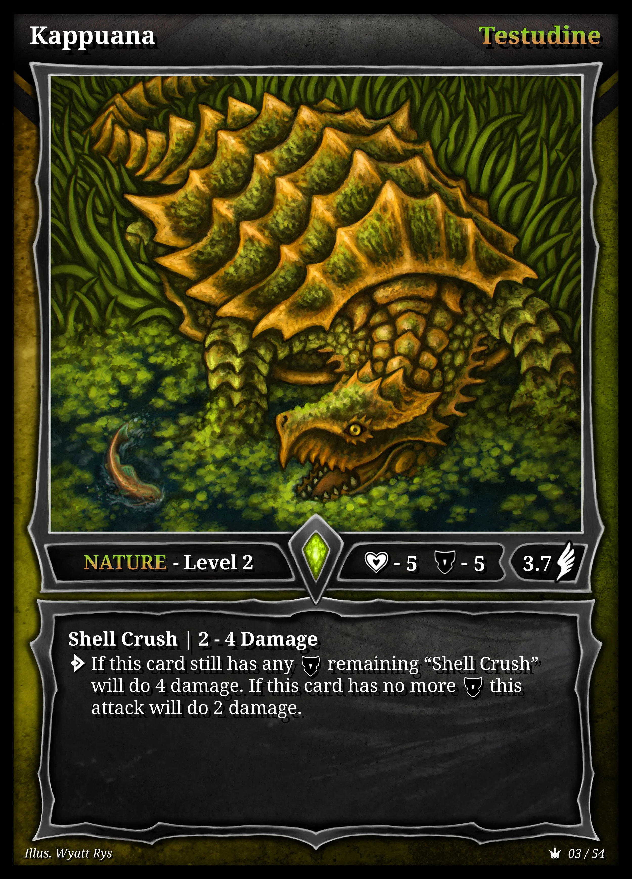 "Such an odd creature. Something like a great turtle crossed with an alligator. Scales as tough as steel and a shell even tougher. They are impenetrable fortresses of reptilian might. Yet what those walls guard seems only to be a simple mind of blissful ignorance. A head through which only the words ‘fish’ and ‘hungry’ seem to pass (and slowly at that). After weeks of study (from a safe distance, of course) I have yet to see even an ounce of intellect or compassion behind those unblinking yellow eyes. Perhaps it is my human bias that drives me to such a conclusion, but I dare say that these ‘Kappuana’ , as the locals call them, seem to be among the dullest beasts I have yet come across… However, one must admit that they do seem quite content in their simple lives. Whereas I am here, in the middle of nowhere, covered in mud, unwashed, sore, and hungry, obsessing over an animal that I ultimately deem foolish… Perhaps, then, we are not entirely so different as I had once assumed, my dear Kappuana. And with that, I declare this ‘expedition’ complete.”
